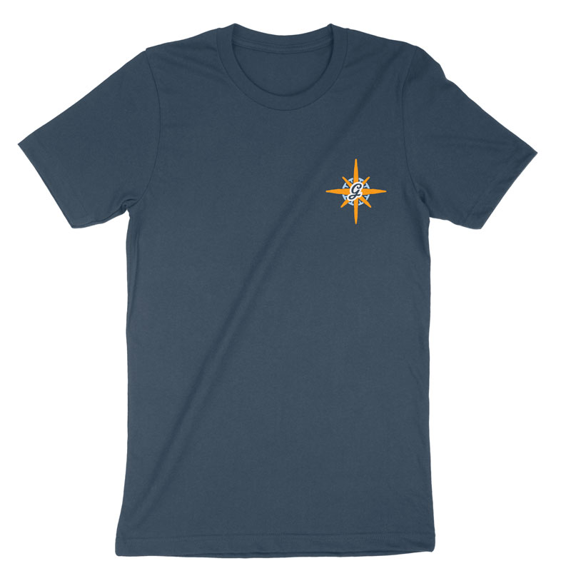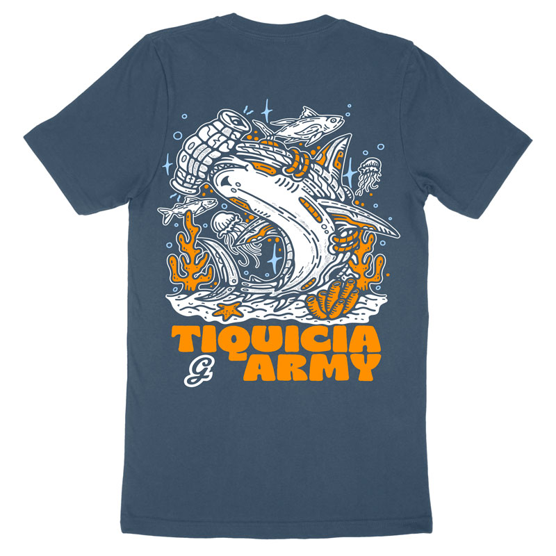 Camiseta azul navy con diseño de Tiquicia Army tiburón martillo en espalda y estrella en el pecho